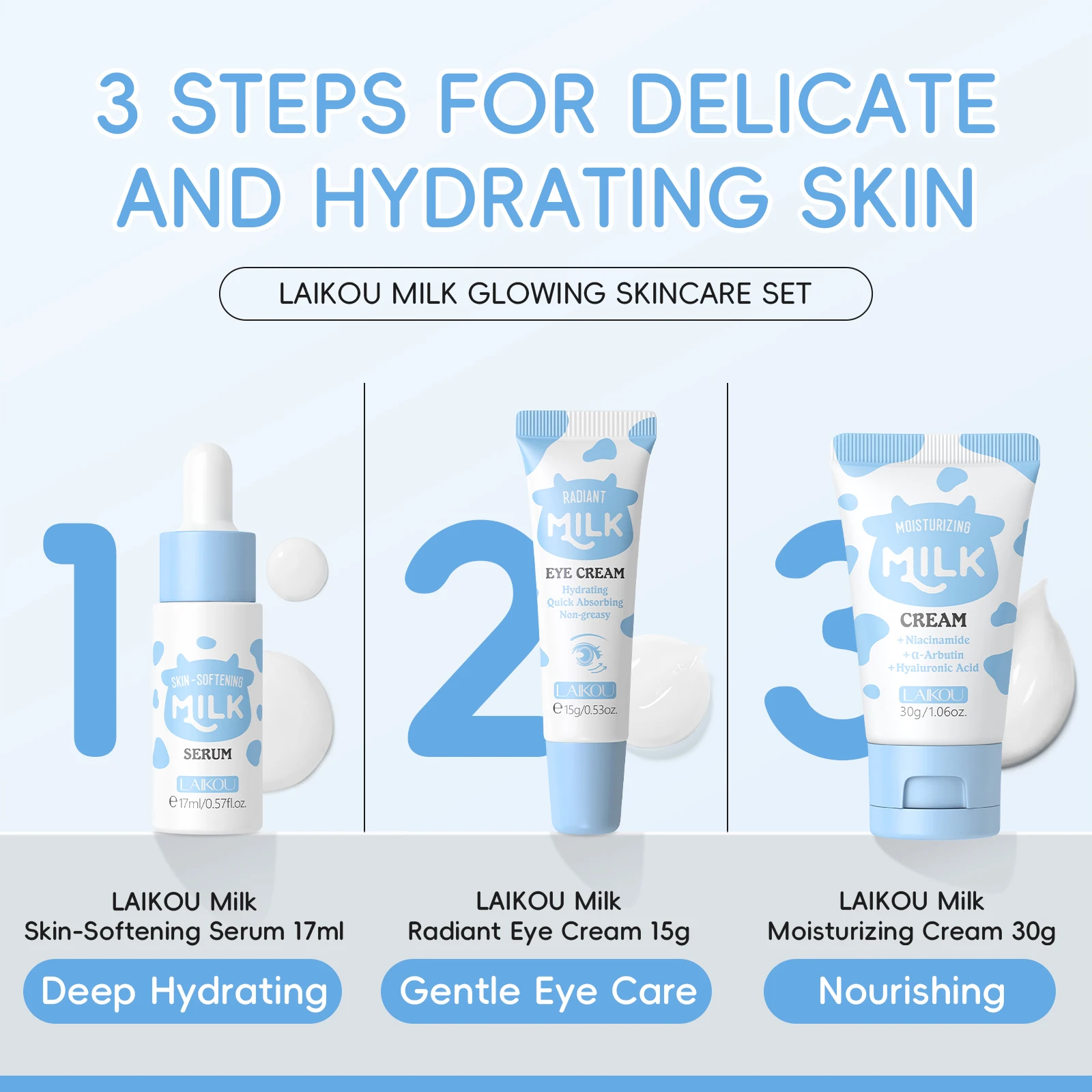 Delicie-se com um brilho aveludado com o Trio brilhante de leite LAIKOU!Este conjunto de luxo combina hidratação movida a leite, nutrição profunda e luminosidade leve para uma “pele de porcelana”.Perfeito para quem busca brilho movimentado – não é necessária rotina de 10 etapas!?